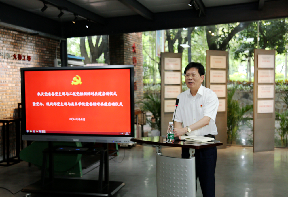 会上,党办、统战部党支部书记与美术学院党委主要负责人签订了《广东技术师范大学机关党委各支部与二级党组织结对共建协议书》,并与美术学院院长互赠了结对共建学习资料。苏敏指出,美术学院党委艺心党支部是在学校党委领导、党委组织部指导下,与党办、统战部党支部共建指导的特色党支部,一是创新设置以“教师-研究生-本科生”为三级梯队的党员组成体系,充分发挥“双带头人”党员教师作为支部书记的“头雁效应”,合力育人;二是采取“固定+流动”相结合的党员管理模式,激发党员的积极性和创造力;三是结合意识形态建设,把基层党建工作渗透进大师工坊,实现党建工作与学院特色发展有效融合;四是把党支部建在重点培育的创新项目团队上,以党建带团建,探索创新创业新模式,努力朝着构建“学习型、创新型、服务型”三型党支部方向奋力前行,从而形成美术学院基层党建新局面。